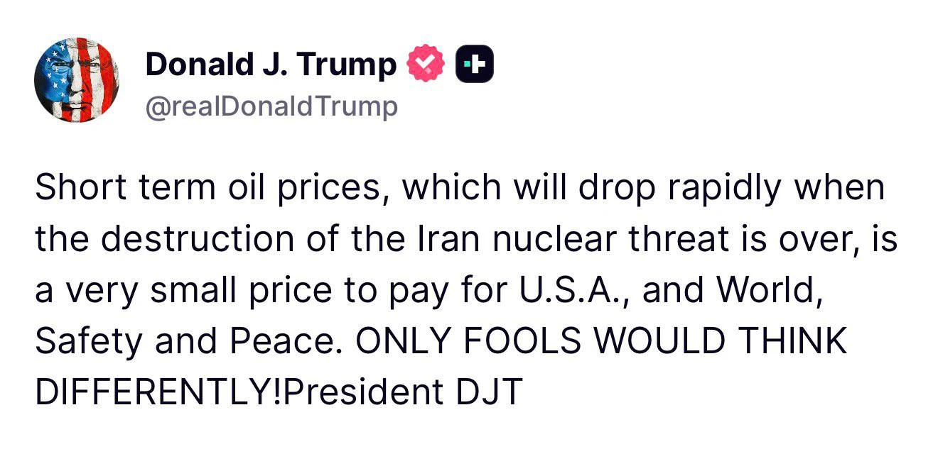 «Краткосрочный рост цен на нефть, который быстро снизится после уничтожения иранской ядерной угрозы, — это очень маленькая плата за безопасность и мир для США и всего мира. Только дураки думают иначе!» — написал он.